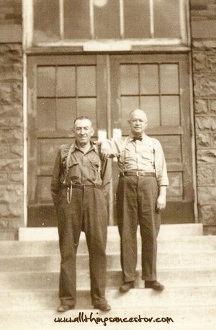 Everest Elliott Watrous worked as a custodian in the public schools of Salt Lake City, Utah in his old age. This photograph was taken about one year before his death. After years of work in the mining business, he worked his last years in this capacity. Everest is our direct ancestor. We assume that the man with the bow tie is the Principal.