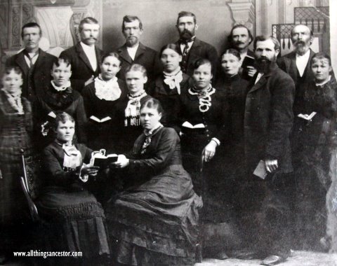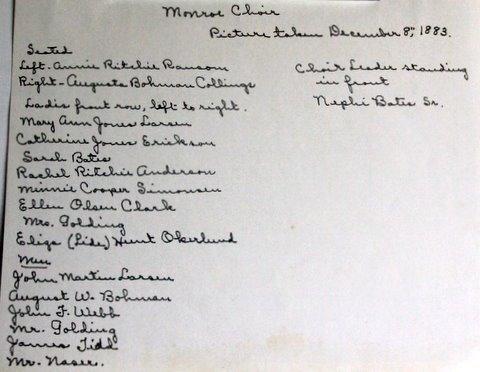 This keepsake photograph shows the choir of the Monroe Ward of The Church of Jesus Christ of Latter-day-Saints in 1883. Monroe is a small town just beyond Richfield, Utah. Both towns are in Sevier County. The man in front on the right is the choir director. He is ancestor Nephi James Bates 1848-1921. He was quite a musician and songwriter according to those who knew him.
