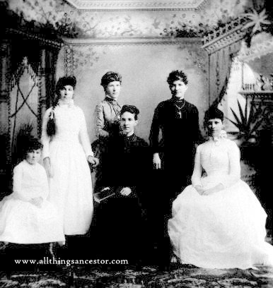 This portrait preserves the six daughters of Henry Maiben and Flora Louisa Maddison.  Eventually all would marry and add their husbands’ names.  They are Elizabeth Harriett Maiben Magleby, Flora Louise Maiben Bates, Phoebe Maiben Candland, Catherine Mary Maiben Candland ( Phoebe and Catherine married brothers ), Emily May Maiben Robbins and Rosina Maria Maiben Jones.  All were born in Utah.