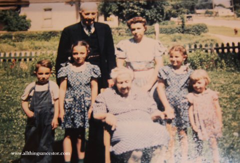 This keepsake photograph was taken at the home of Nephi and Flora Bates in Richfield, Sevier County, Utah in about 1950.  Seated is Sarah Sprague Bates.  Behind her is her son Nephi James Bates (1875-1958) and her granddaughter Lucile Bates Ford.  On either side of Sarah are her great-grandchildren.  They are the children of her granddaughter Lucile.  On the left are Dorothy and John and on the right aare Margaret and Diane.