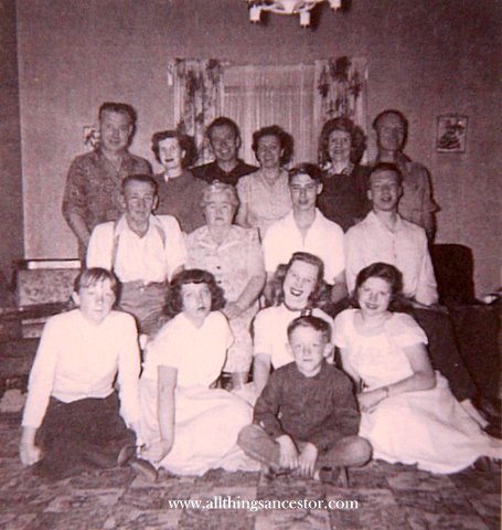 This keepsake photograph shows three generations of this Watrous family. Left to right back row: Mervin and Maryan Watrous, Everest Raymond and Mildred Watrous, Freida and Wayne Watrous. Middle row left to right: Everest Elliott Watrous and his second wife Susie, Gary Watrous and Michael Watrous. Front row left to right: Patricia Watrous, Carolyn Watrous, Diane Watrous and Gayle Watrous. Middle: direct ancestor Thomas Watrous. This photograph was taken in the home of Everest and Susie in Salt Lake City, Utah.